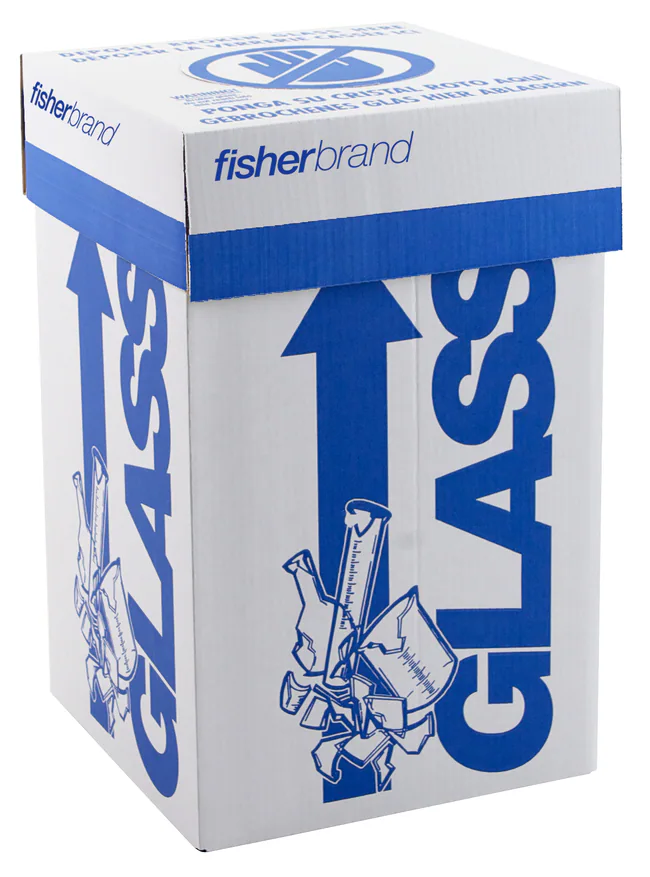 ポリエチレン裏地の段ボールで作られた丈夫なガラス廃棄ボックス。Fisherbrand™ ガラス廃棄ボックス(ベンチトップ)は、ガラス廃棄物を他の廃棄物と分別して保管できます。